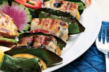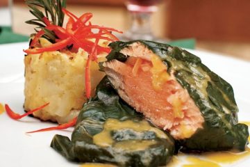Portakal soslu ve pazı yaprağına sarılmış somon