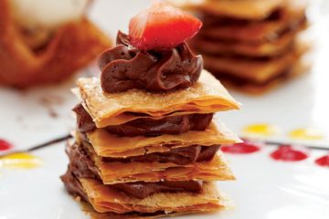 Çıtır baklava yaprakları arasında çikolata mus