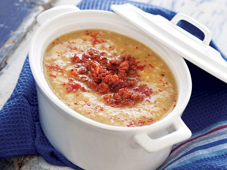 9. Çorbayı kaselere paylaştırıp üzerine kırmızı pul biber serpin..