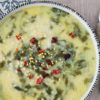 - Çorbanın suyundan bir kepçe kadar ekleyerek terbiyeyi ısıtın ve yavaş yavaş karıştırarak çorbaya ilave edin..