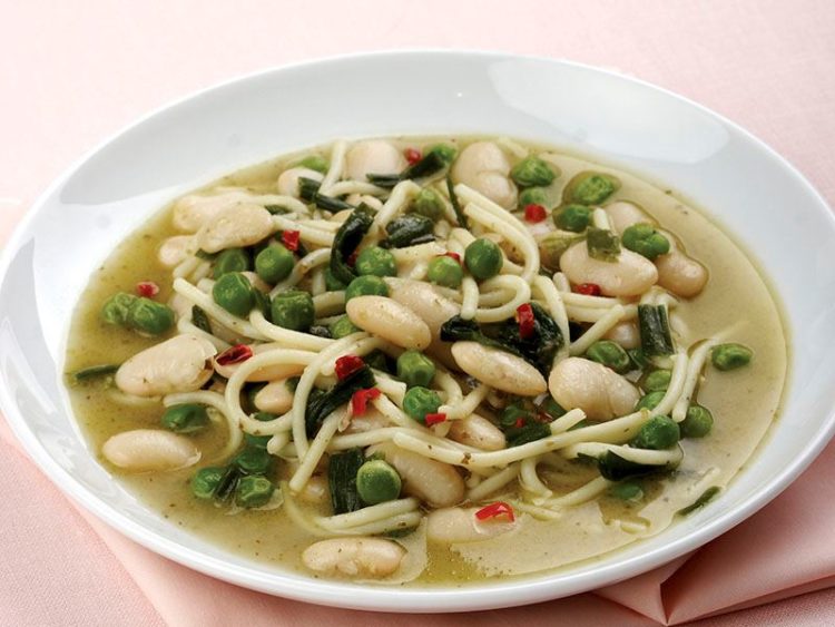 - 1 su bardağı haşlanmış kuru fasulye 5 taze soğan (yeşil kısımları) 700 ml sebze suyu 1/4 paket spagetti makarna 1 tatlı kaşığı pesto sos 1 çay bardağı bezelye 3 yemek kaşığı zeytin yağı Kırmızı pulbiber Tuz