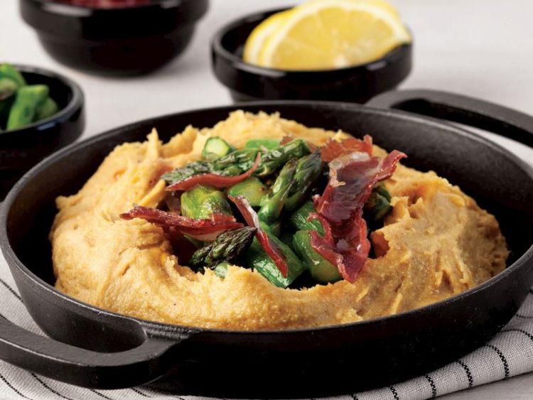 Güveçte pastırmalı ve kuşkonmazlı humus