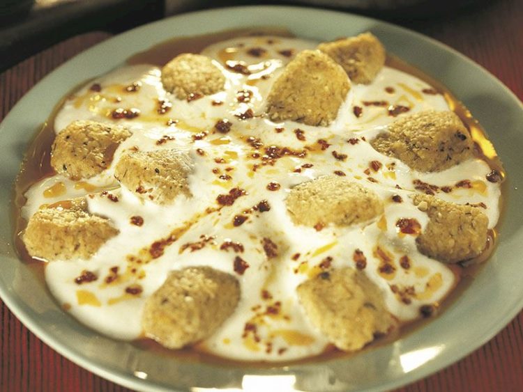 - Sarımsaklı yoğurdu köftelerin üzerine yayıp yağda kızdırılmış pulbiberi gezdirerek dökün..