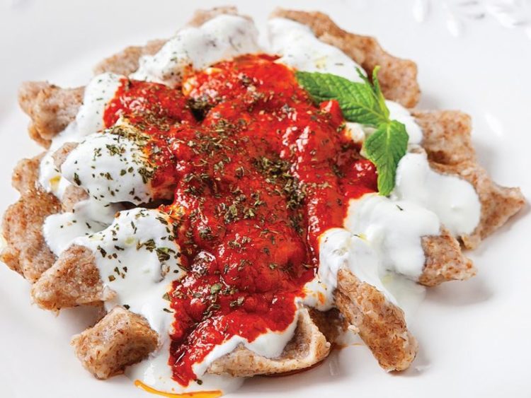 11. Bulgur köftelerinin üzerine sırasıyla sarımsaklı yoğurt ve salçalı sostan gezdirin..