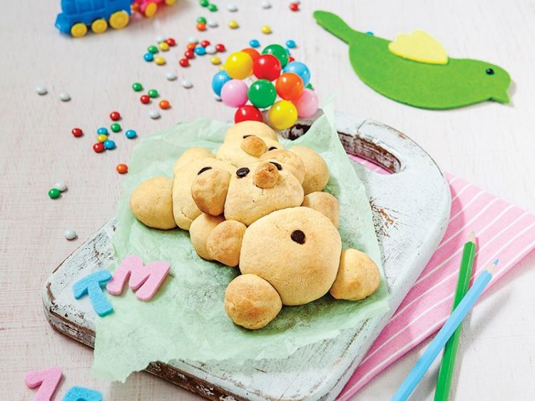 - Hamurdan parçalar koparıp yuvarlayarak ayıcık şekli oluşturun gözlerine ve göbeğine birer damla çikolata yerleştirip önceden ısıtılmış fırında yaklaşık 20 dakika pembeleşene kadar pişirin..