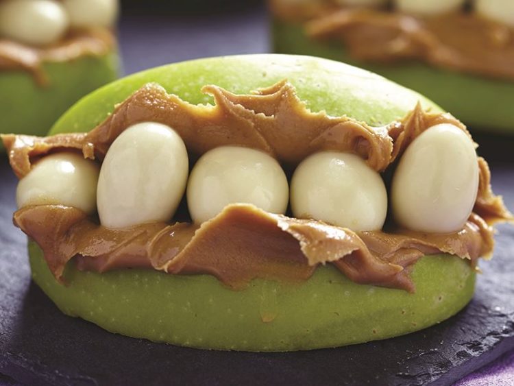 2. Bir parça elma diliminin kesik tarafına bolca fındık ezmesi sürün..