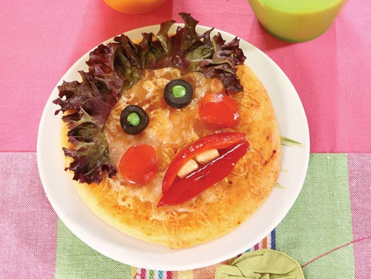 11. Pizzanın üzerine yüz şekli yapmak için; gözler için dilimlenmiş siyah zeytin ve bezelye taneleri, yanaklar için ortadan ikiye kesilmiş kiraz domates, dudaklar için kırmızıbiber parçaları, dişler için kaşarpeyniri, saçlar için kıvırcık marul yaprakları kullanabilirsiniz..
