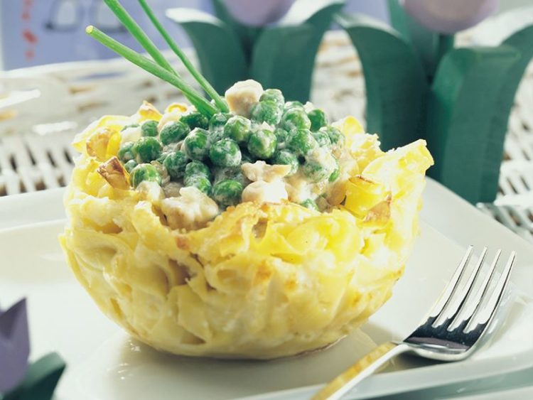 Beşamelli bezelyeleri makarna yuvalarına paylaştırın..
