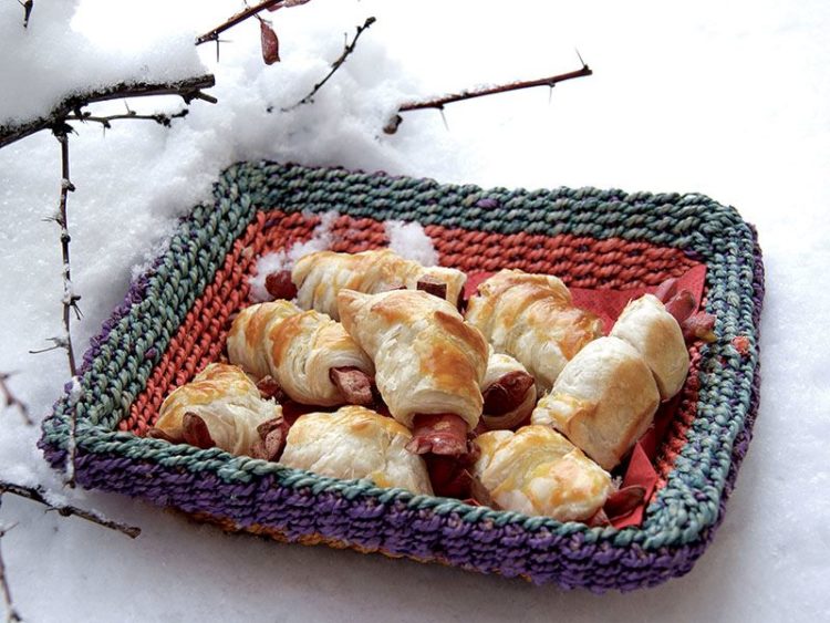 3. Her bir milföy parçasının ortasına 1 sosis koyup rulo şeklinde sarın..