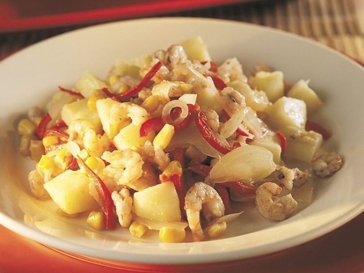 - 200 gr karides 2 yeşil elma 1 soğan 1 küçük salçalık kırmızıbiber 120 gr konserve mısır tanesi 2 çay bardağı su 2 çay kaşığı köri Tuz
