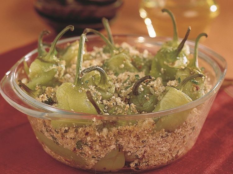 • 4 çorba kaşığı mısırözü yağı 1 kg çarliston biber Yarım bayat ekmek içi 4 diş sarımsak 4 dal maydanoz 50 gr lor peynir 3 çorba kaşığı çekilmiş ceviz Tuz