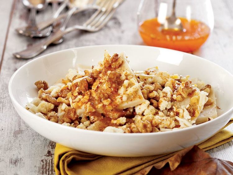 - Üzerlerine kızdırılmış tereyağı gezdirip ufalanmış beyaz peynir, ceviz ve çökeleği serpin..