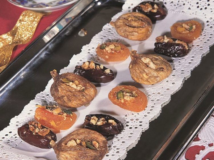 Hazırladığınız kuruyemişli meyveleri servis tabağına değişimli olarak dizip servis yapın..