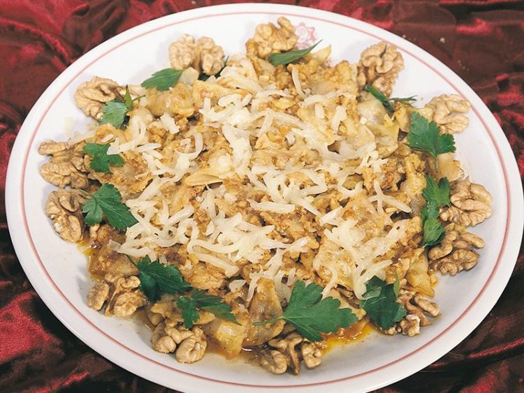 - Bir kat daha daha mantı yayın, tekrar ceviz ve kaşar peyniri serpin..
