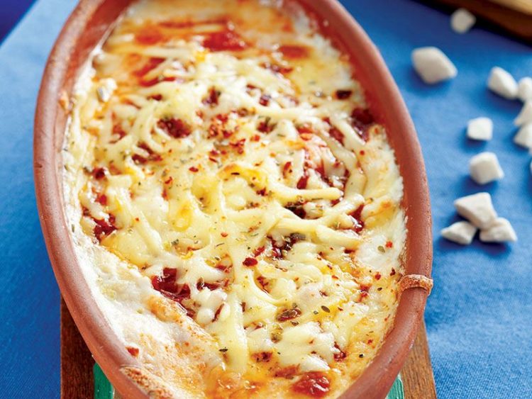 - Güvece sırasıyla küp doğradığınız beyaz peyniri, mozzarella peynirini, domates sosunu ve kaşar peyniri alın..