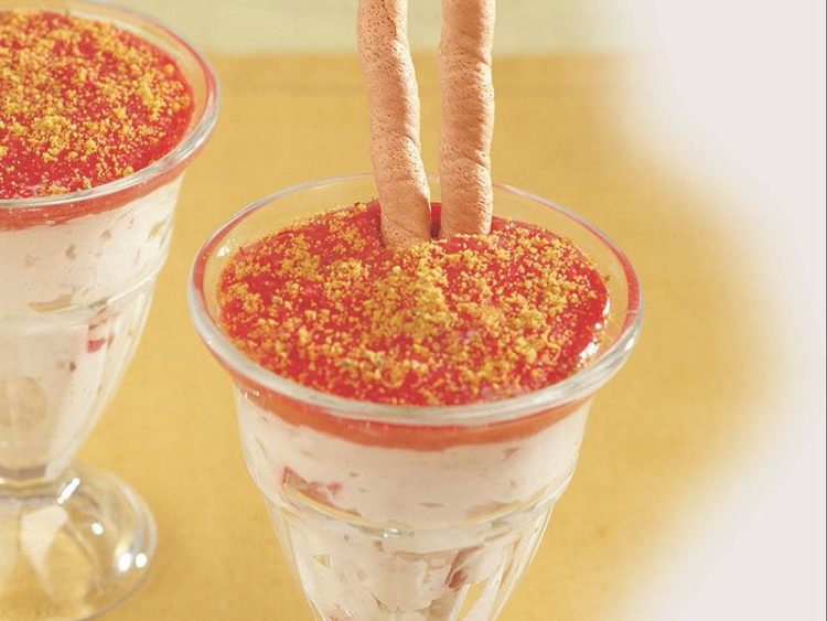 - 500 gr tuzsuz lor peyniri 3 su bardağı süt 1 çorba kaşığı pudra şekeri 1 paket toz kremşanti 1 çay bardağı iri çekilmiş ceviz 1 tatlı kaşığı tarçın 250 gr çilek 1 çorba kaşığı hindistancevizi Sos için: 250 gr çilek 1 tatlı kaşığı mısır nişastası 2 çorba kaşığı tozşeker Süsleme için: 1 çorba kaşığı çekilmiş Antep fıstığı 6 çilek 6 rulokat
