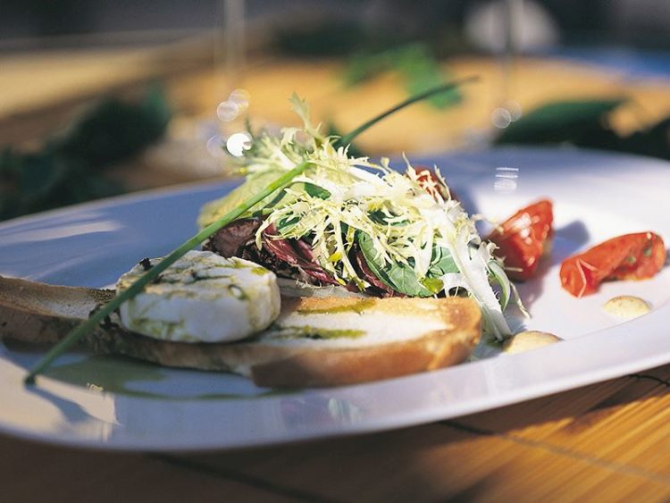 - 2 dilim kızartılmış Fransız ekmeği 2 domates Yarım su bardağı zeytinyağı 2 dal taze mercanköşk 2 dal taze kekik 2 dal taze biberiye 2 dilim keçi peyniri 1 dal frenksoğanı Dört mevsim yeşilliği Taze baharatlı sos için: 1 limonun suyu 1 kahve fincanı zeytinyağı 5