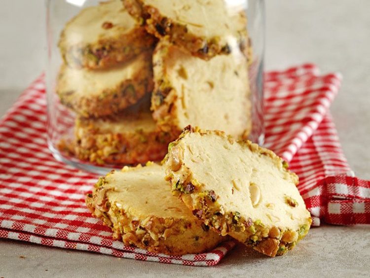 - Ceviz, Antep fıstığı ve şekeri harmanlayıp hamurun etrafına bulayın..