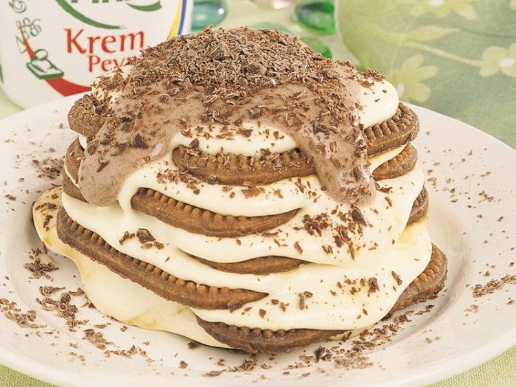 9. Üzerine tekrar 2 bisküvi ve tekrar krema sıralamasıyla malzeme bitene kadar işlemi tekrarlayın..