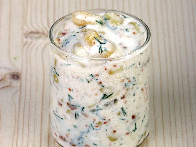 - Krema, yoğurt, krem peynir, limon suyu, tuz ve kırmızı pulbiberi bir kapta çırpın..