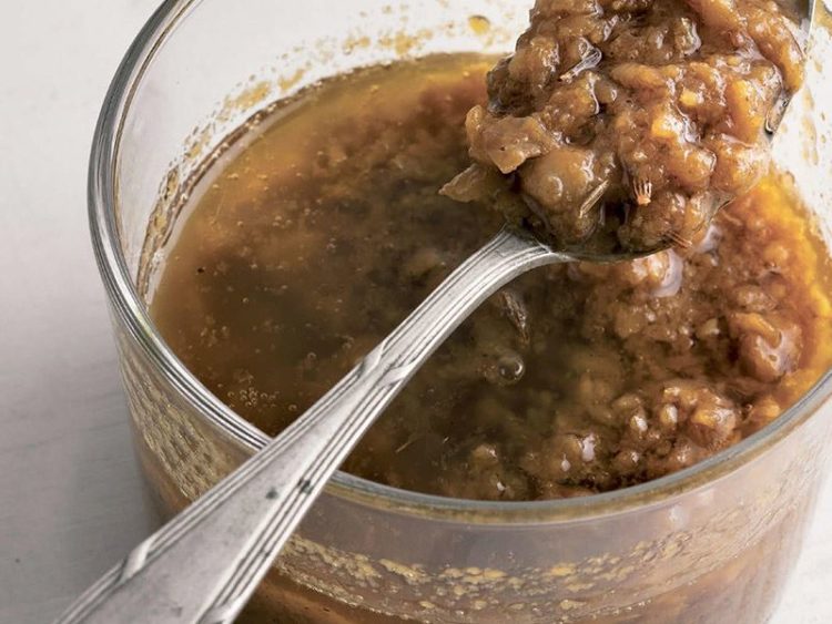 - Ayrı bir kasede üzüm pekmezini, sirkeyi, kalan zeytinyağını, kimyon tohumlarını ve arzunuza göre bir miktar tuzu karıştırın..