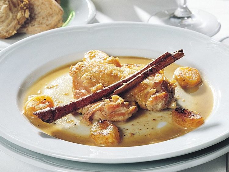 - 1 kemiksiz piliç but 1 çorba kaşığı tereyağı 5-6 kuru kayısı 2 çubuk tarçın 1 su bardağı tavuk suyu 1 kadeh beyaz şarap Tuz