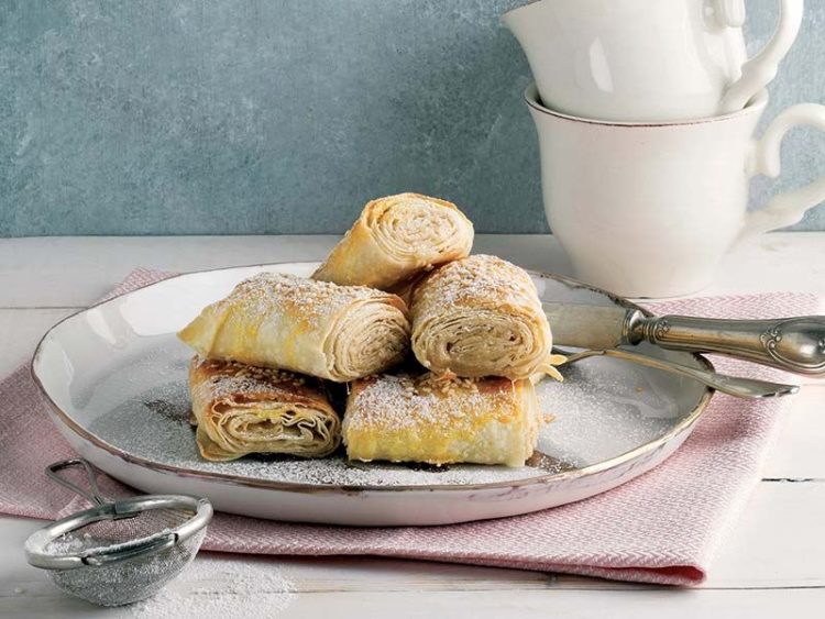 - Katladığınız yufkaya 1 yemek kaşığı tahin sürüp, 1 yemek kaşığı toz şeker serpin..