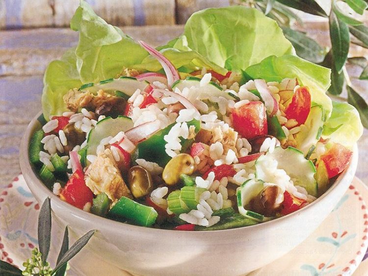 - 1 su bardağı pirinç 1 kırmızı soğan 1 domates 1 salatalık 1 yeşil biber 3-4 küçük turp Birkaç göbek salata yaprağı 1 taze soğan 150 gr konserve ton balığı 5-6 yeşil zeytin 3 çorba kaşığı zeytinyağı 3 çorba kaşığı limon suyu Tuz
