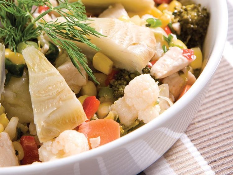 - 2 enginar 300 gr brokoli 300 gr karnabahar 1 tavuk göğüs fileto 1 havuç 2 kırmızı biber 2 dal taze sarımsak 2 dal taze soğan 1 su bardağı konserve mısır 1 çay bardağı zeytin yağı 1 limon Tuz