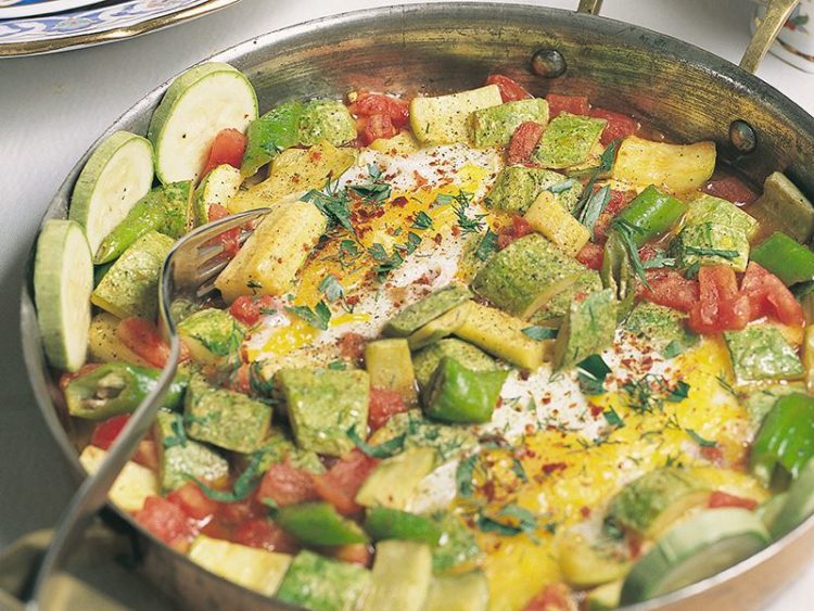 - 3 kabak 4 çorba kaşığı sıvıyağ 4 yumurta 8 sivribiber 2 domates 1 çay kaşığı kırmızı pulbiber 2-3 dal maydanoz ve dereotu Tuz
