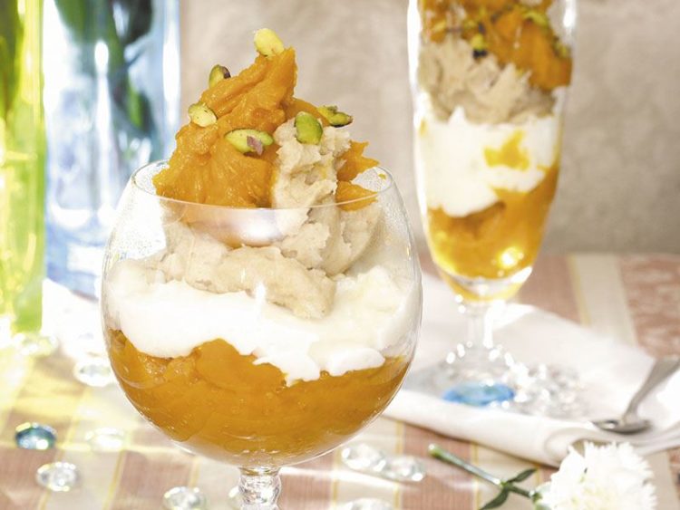 14. Servis kadehlerine sırasıyla kabak, muhallebi, kestane ve kabağı ilave edip antepfıstığı ile süsleyin..