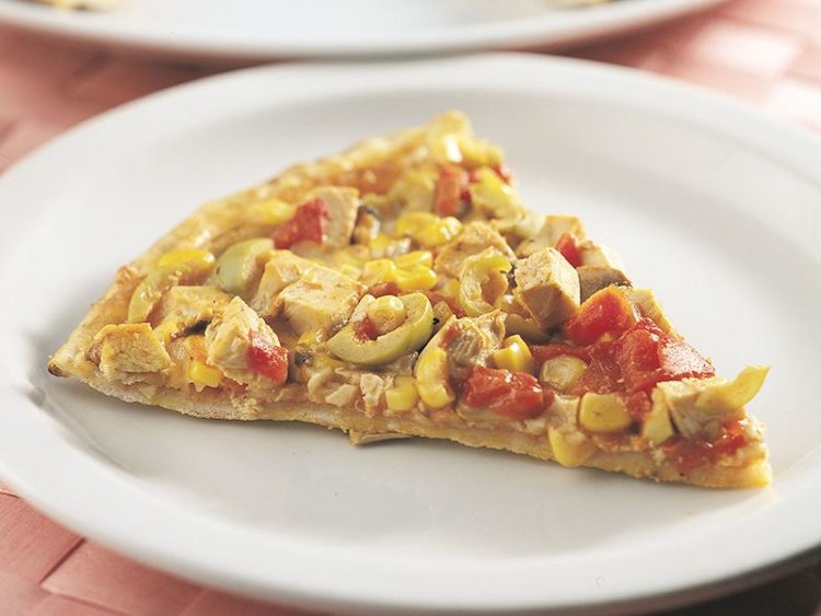 - Tavuk eti, kokteyl zeytin, mısır, mantar ve acı sosu bir kapta karıştırıp pizzanın üzerine yayın..