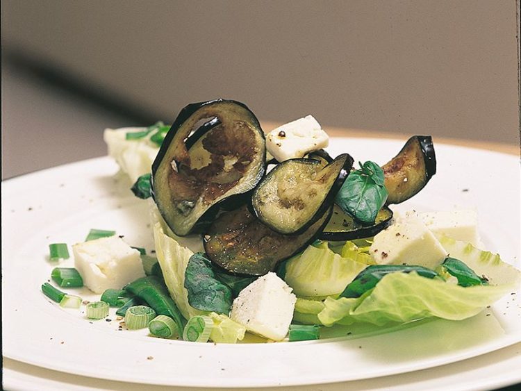 - 2 patlıcan 2 çorba kaşığı zeytinyağı 4 büyük marul yaprağı 4 küçük marul yaprağı 1 taze soğanın yeşil kısımları 250 gr beyazpeynir 1 demet fesleğen 2 çorba kaşığı sızma zeytinyağı 2 çorba kaşığı limon suyu Birkaç tane kırmızıbiber Tuz