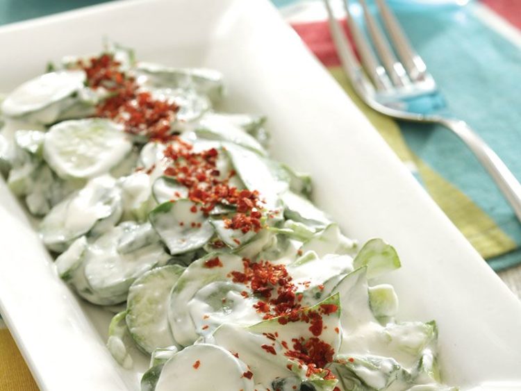 Semizotu ve salatalık dilimlerini yoğurtla karıştırın..