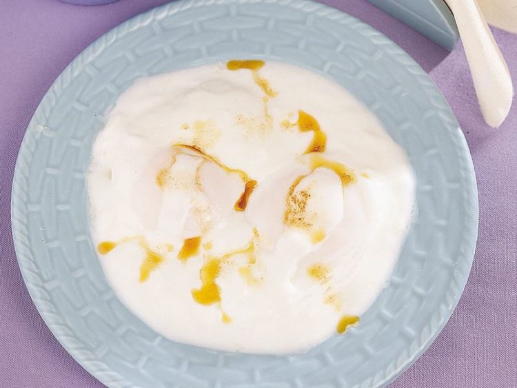 - Yumurtaların üzerine sarımsaklı yoğurt dökün..