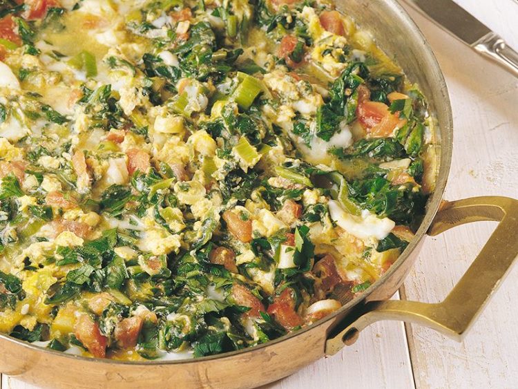 • 2 pırasa8-10 ıspanak yaprağı200 gr domates40 gr tereyağı6 yumurta1 demet maydanozTuz