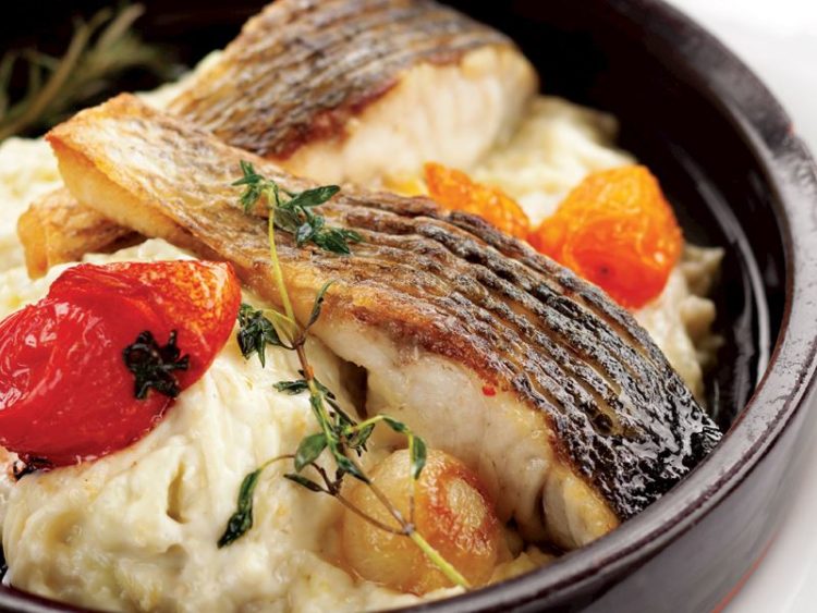 - Servis tabağına önce beğendi daha sonra levrek ve kızarmış domates ve arpacık soğanı ilave ederek servis yapın..