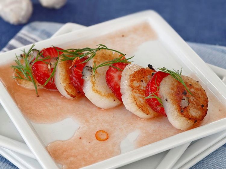 - Servis tabağına sırasıyla bir dilim deniz tarağı bir dilim çilek yerleştirin..