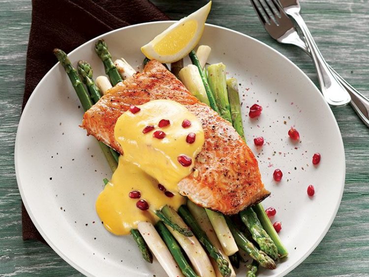 9. Servis tabağına sotelenmiş kuşkonmazları yayıp somon balığını yerleştirin..