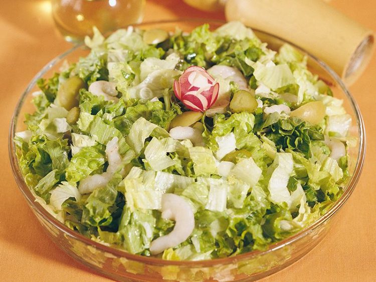 - 4 çorba kaşığı zeytinyağı 1 kıvırcık salata 1 kase dondurulmuş karides 1 küçük kırmızı turp 3 dal taze soğan 3 salatalık turşusu 4 çorba kaşığı limon suyu 6-7 yeşil zeytin