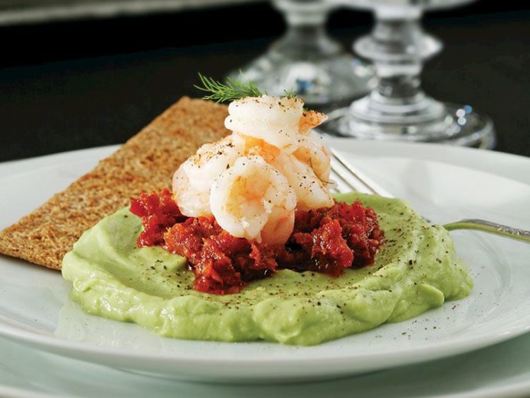 - Servis tabağına sırasıyla avokado, kurutulmuş domates ve karidesleri dizin..