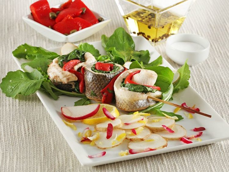 - Sıcak suya batırıp çıkardığınız roka yaprakları ile şerit kestiğiniz közlenmiş biberleri balıkların üzerine yerleştirip rulo şeklinde sarın..