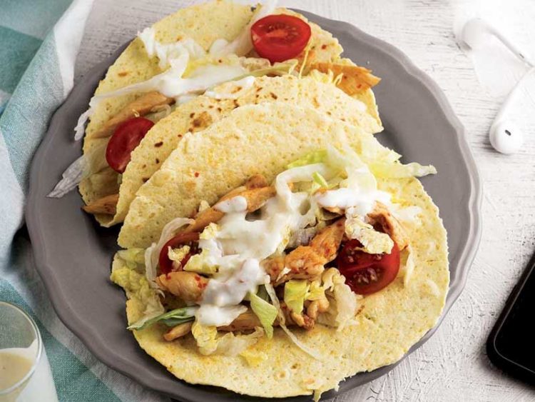 - İnce doğranmış göbek veya kıvırcık, şerit kesilmiş tavuk parçaları ve ikiye bölünmüş çeri domatesleri lavaş ekmeğinin ortasına yerleştirin..