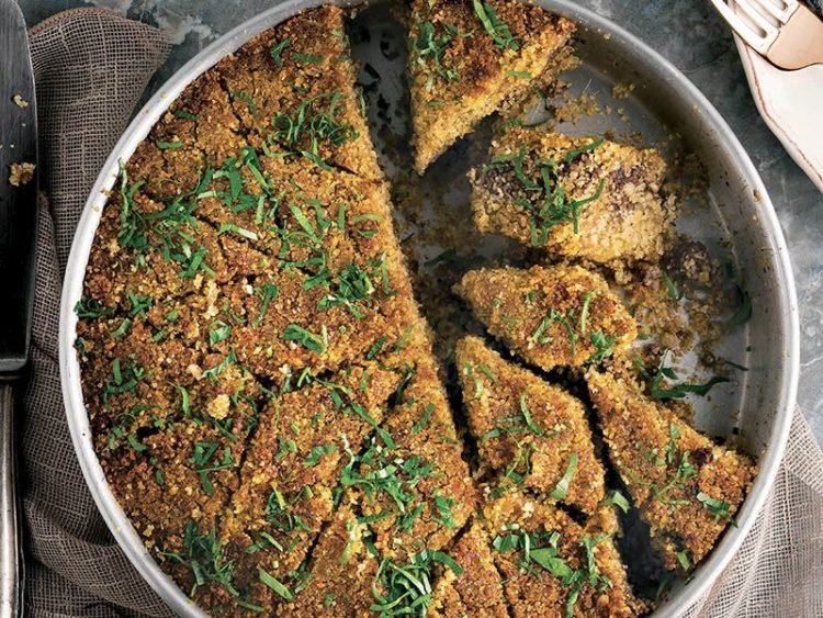 8. Köftenin dış harcının yarısını, hafif yağladığınız 30-35 santim çapında bir tepsiye elinizle bastırarak yayın..