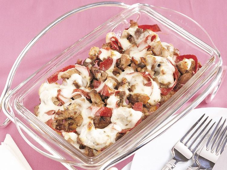 Sotelenmiş hindi etini derin bir fırın kalıbına alın.. - Salam şeritlerini etlerin üzerine dizip hazırladığınız sütlü sosu gezdirerek dökün..