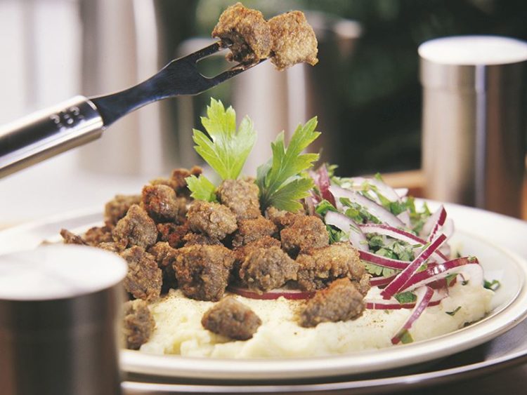 - Servis tabağına önce patates püresini sonra da ciğeri yayın..