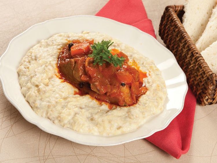 - Servis tabağına beğendiyi yayıp üzerine etleri yerleştirerek servis yapın..