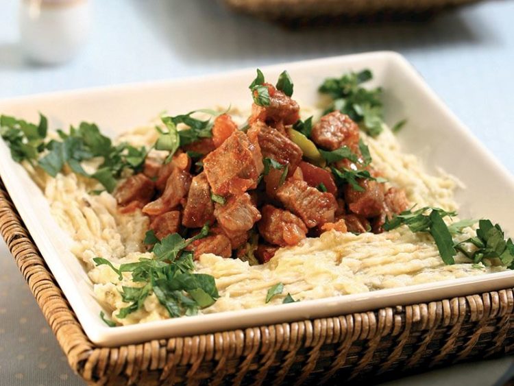 - Patlıcan beğendiyi servis tabağına alıp ortasına soslu eti ilave edin..