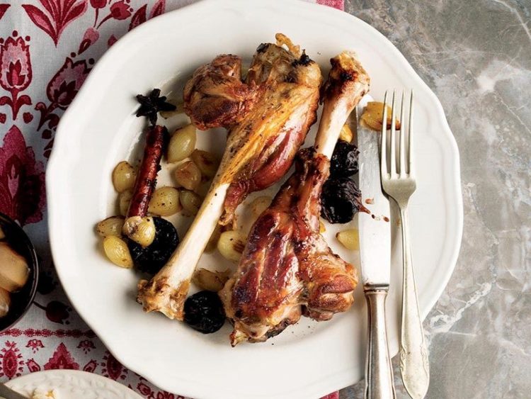 - Bir fırın torbasına arpacık soğan, sarımsak, erik, çubuk tarçın, biberiye ve taze kekiği koyun..