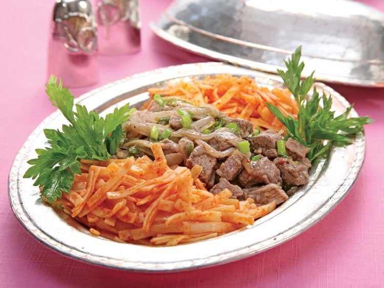 - Servis tabağına erişteyi alıp ortasına eti ilave edin..